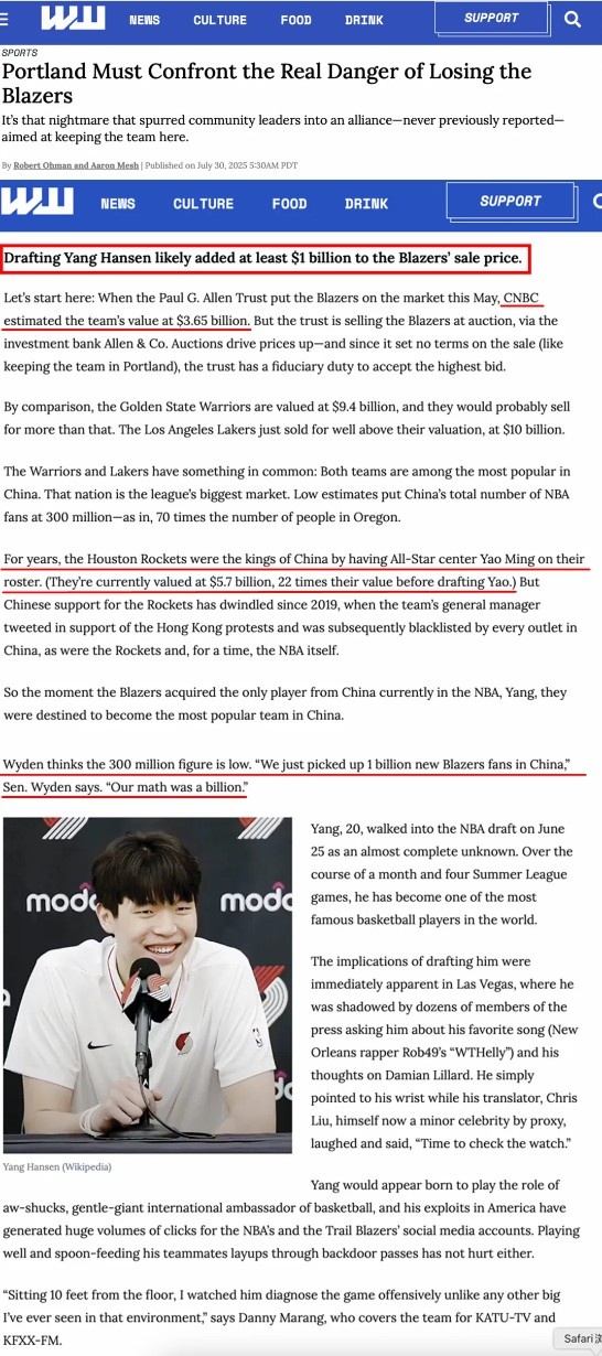 波特兰当地权威媒体《威拉米特周刊》在交易前曾刊发专题报道,暗示杨瀚森可能为球队带来额外价值。该媒体资深记者罗伯特·奥赫曼在其万字长文中预测,开拓者估值可能突破45亿美元。值得注意的是,《福布斯》去年10月估值仅35亿,CNBC今年5月估值36.5亿,奥赫曼认为杨瀚森或带来10亿溢价。
